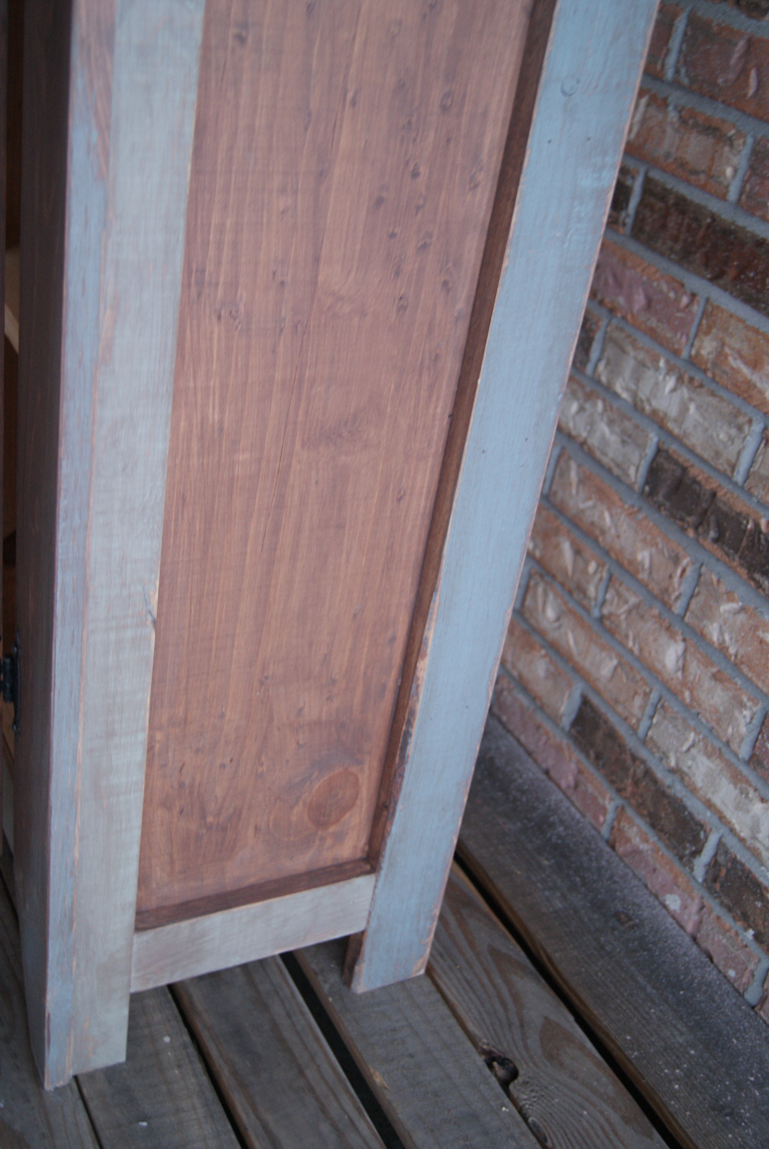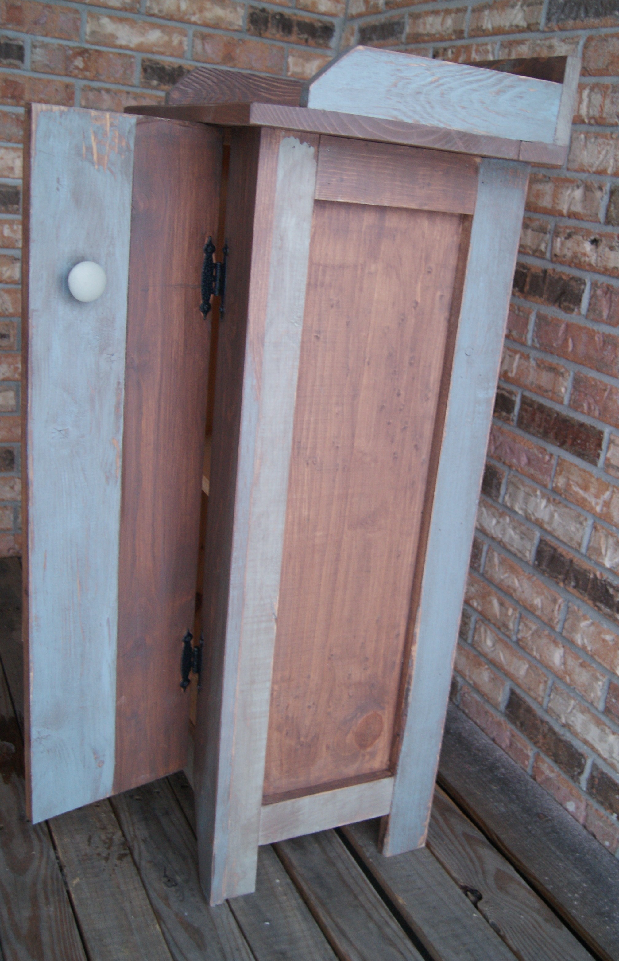 Rustic Jelly Cupboard or bread box. 3 colors of shabby finish. Early American Blue and light green over walnut stain.