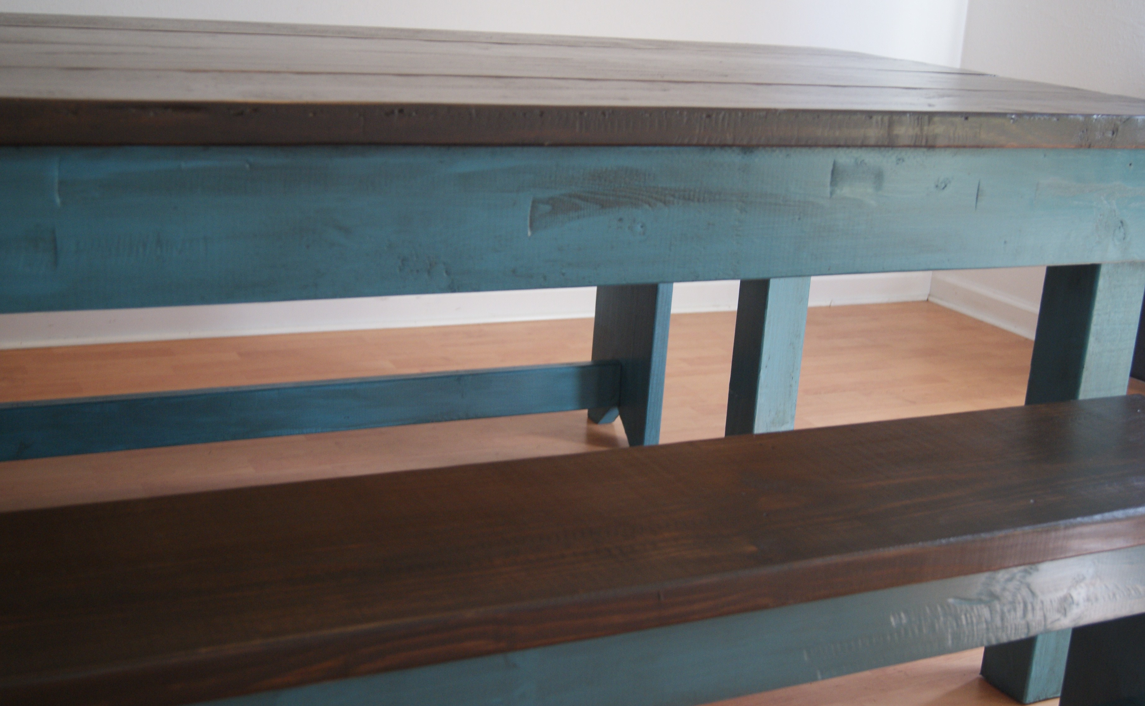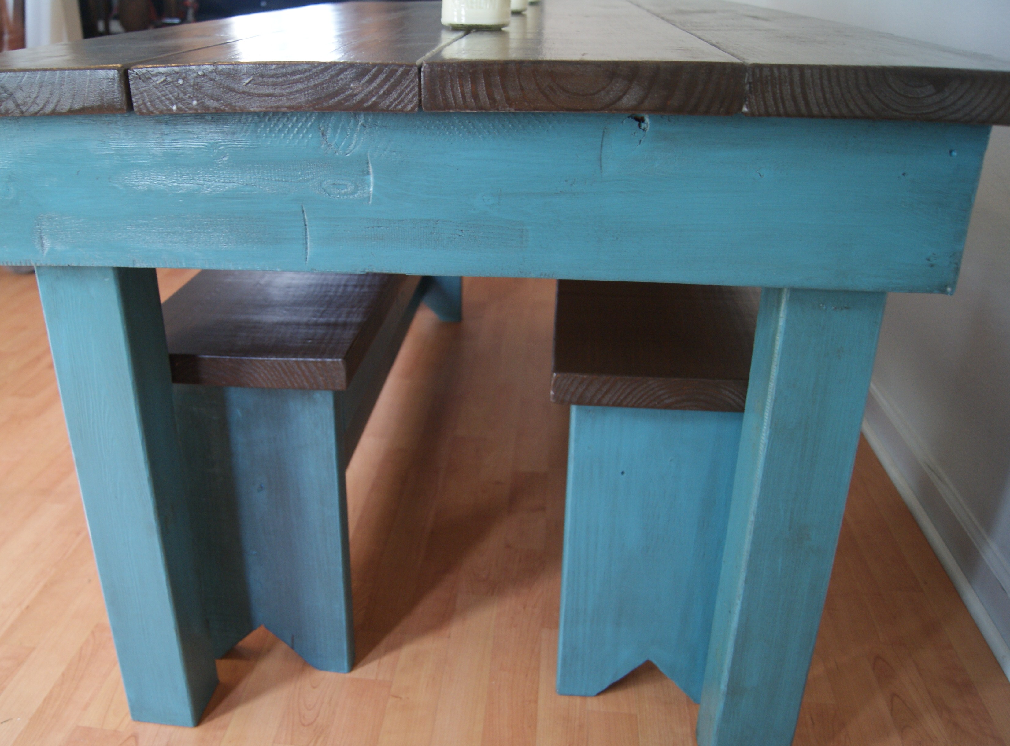 These benches are sturdy and nice looking. The benches shown are blue with a walnut top. They have been glazed to bring out all the unique details. Covered in water based poly ensures long life. Glued connections help make this heirloom quality. The deep walnut bench tops are a favorite. The darker color shows the beautiful timbers character.